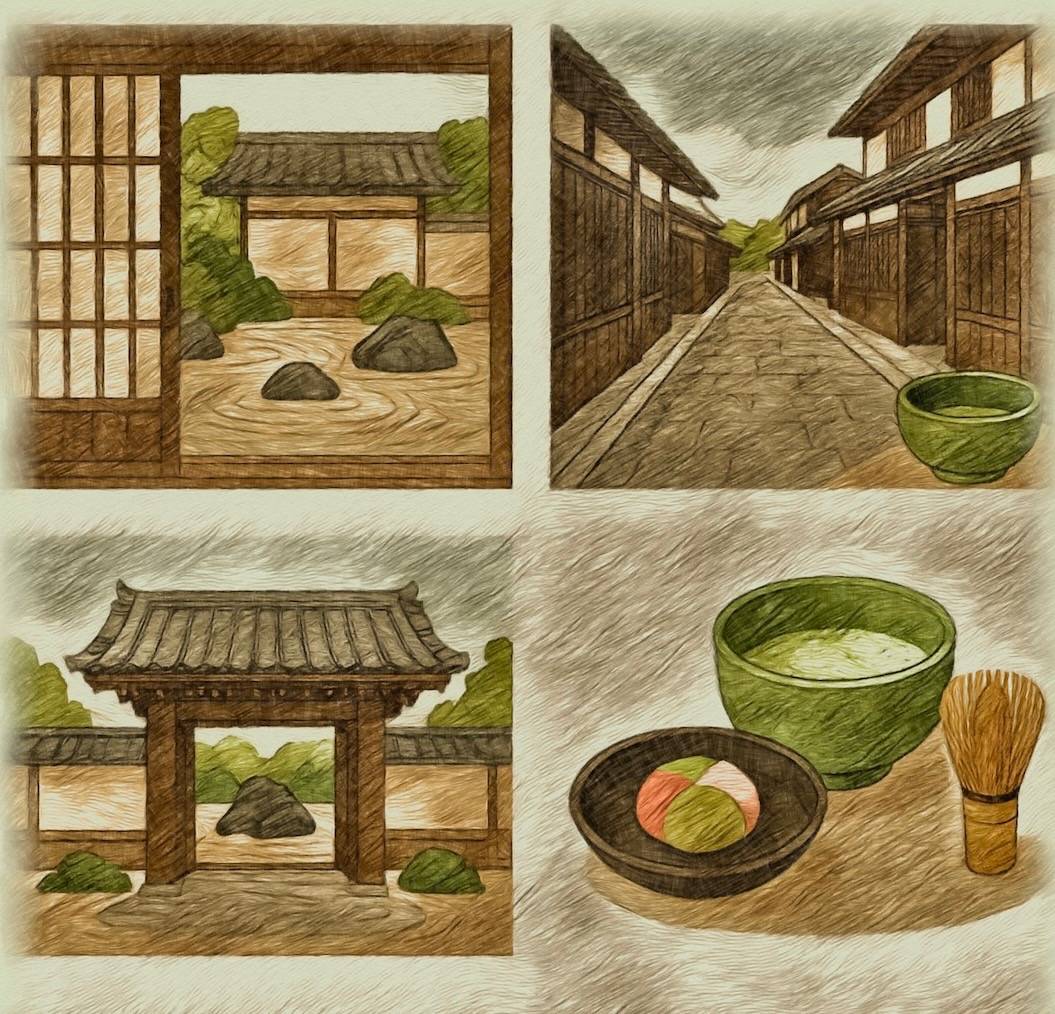 枯山水の静けさ、精進料理の滋味、茶室の余白、そして贈り物に込められた想い——それらが織りなす紫野の風景は、京都の「文化のある日常」を体現しています。